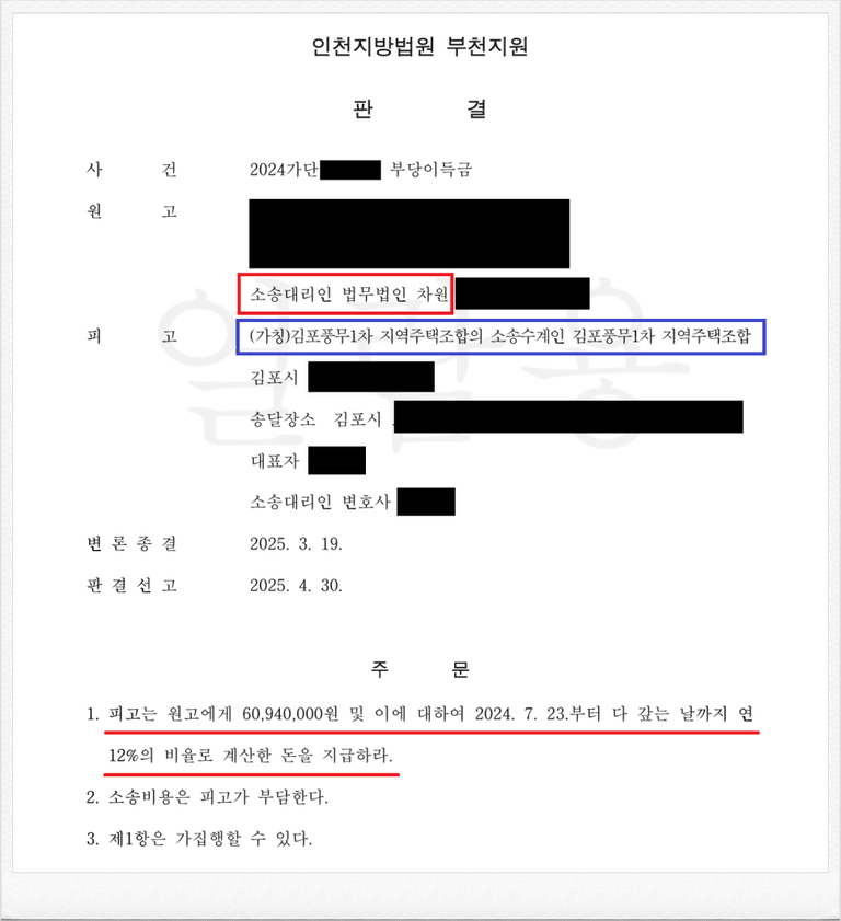 지역주택조합 관련 납입금 반환 소송을 맡기실 경우, 별도의 추가 비용 없이 강제집행까지 전 과정을 책임지고 진행하며, 실제로 납입금을 반환받기 전까지는 성공보수를 청구하지 않습니다.