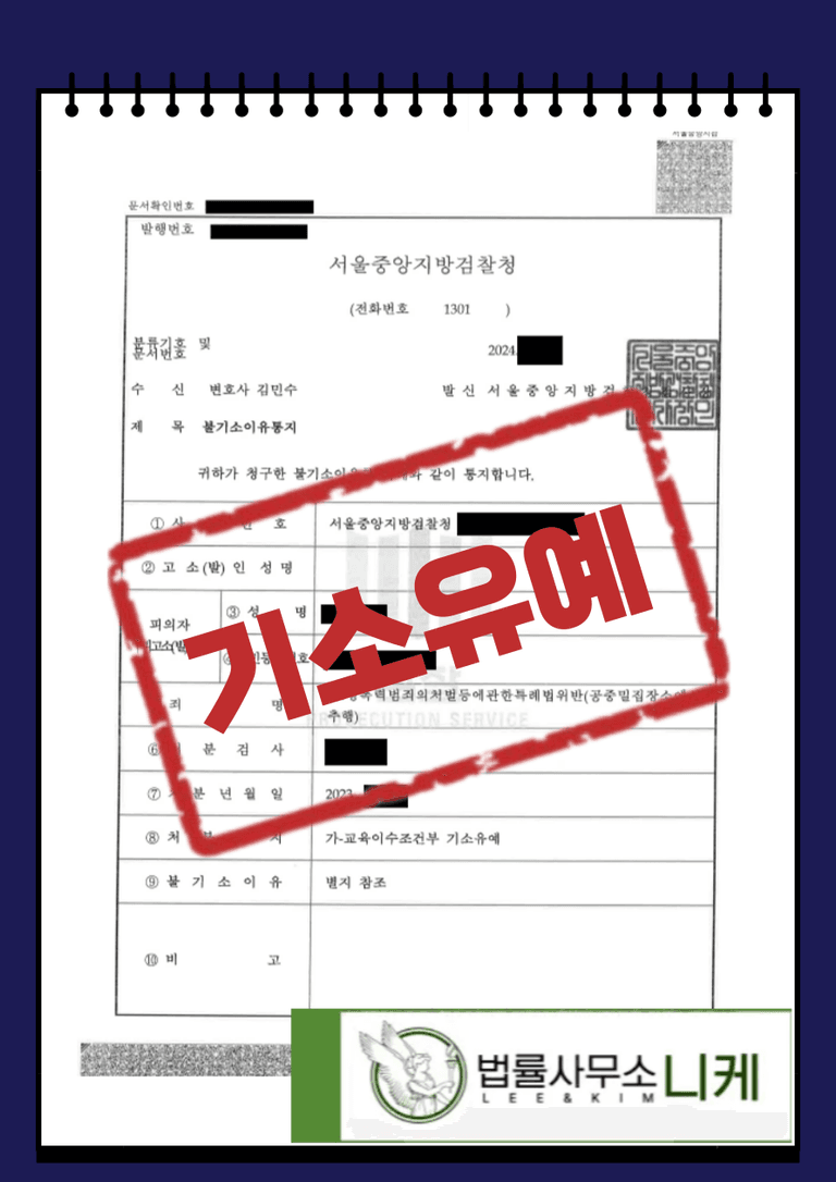 그 결과 의뢰인은 성폭력범죄의처벌등에관한특례법(공중밀집장소에서의추행)위반 혐의를 받고 법정형으로 최소 벌금형 최대 3년의 징역형을 선고받을 수 있었음에도 불구하고 기소유예 처분을 받을 수 있었습니다.
