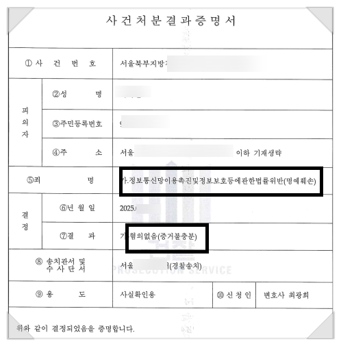 검사는 저의 의견서의 내용을 수렴하여 의뢰인의 발언이 정보통신망법상 명예훼손의 구성요건을 충족하지 않는다고 판단하였고 혐의없음 결정을 하였습니다.