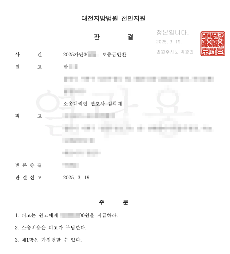 [전부승소] 보증금반환소송 전부승소