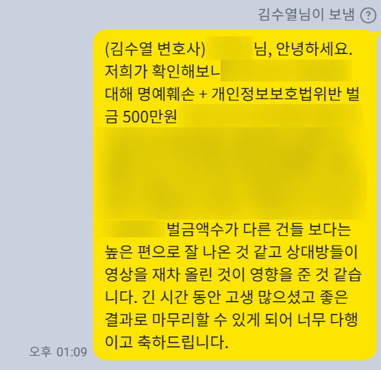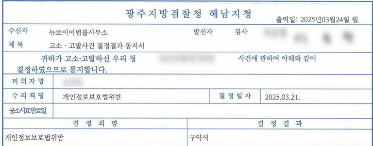 철저히 주장한 끝에, 경찰에서 사건 송치, 검찰에서 최종 개인정보보호법위반 혐의 인정하여 상대방을 벌금형 500만원으로 기소하는 쾌거를 이뤄내었습니다.