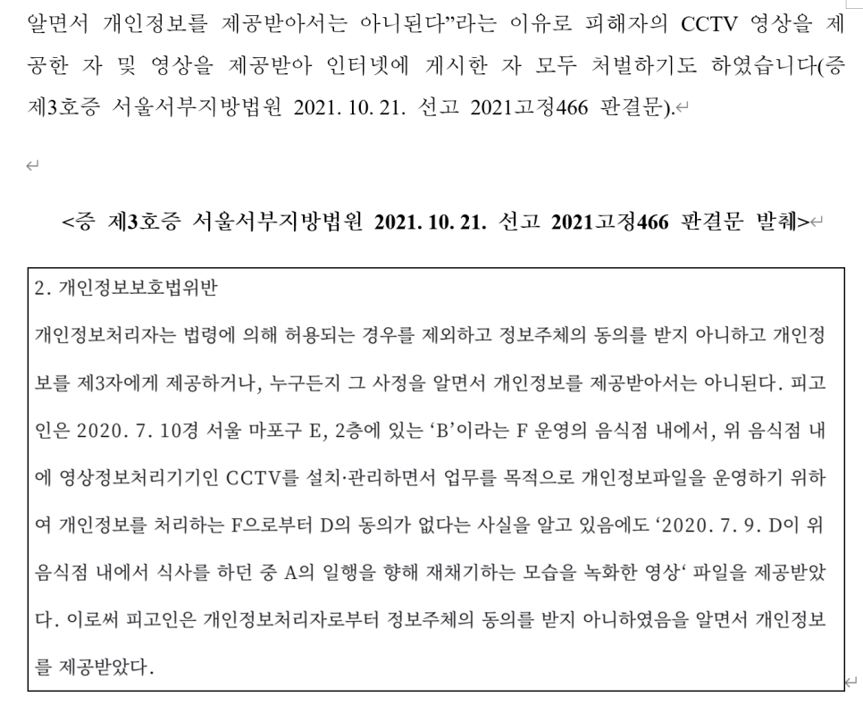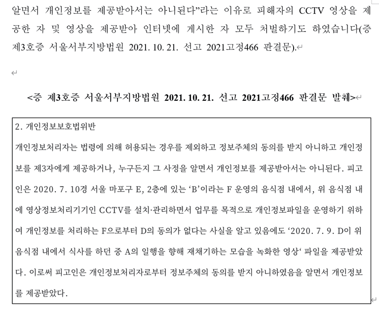 그런데 상대방은 그냥 일반인이 아니라 해당 카페를 운영하는 자로서 CCTV도 관리, 감독하는 역할을 갖고 있으니 '개인정보처리자'의 지위에 있는 것이었지요. 저희는 이러한 개인정보보호법 요건들을 일목요연하게 조목조목 설명하며 유사한 사안에서 처벌된 하급심 판례들까지 제시하였습니다.