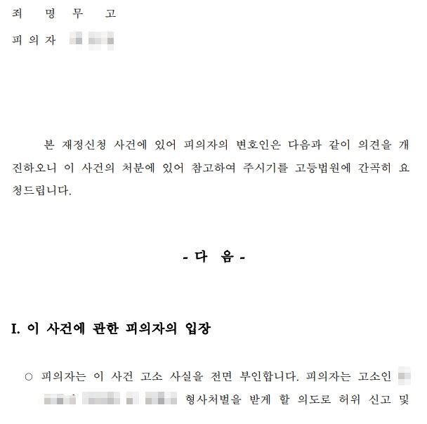당연히 피의자 입장에서도 “당연히 기각되겠지”라고 마냥 안심하고 있어서는 안 됩니다. 재정신청 과정에서는 별도의 수사가 이루어지지 않기 때문에, 고소인이든 피의자든 할 수 있는 것이라고는 변호인이나 고소대리인을 통해 서면공방을 벌이는 것뿐입니다. 이 사건에서도 고소인은 지속적으로 변호인의견서와 추가자료를 내면서 재정신청 인용을 구하였고, 이에 저희 쪽에서도 재정신청기각을 구하는 반박 의견서를 제출하였습니다.