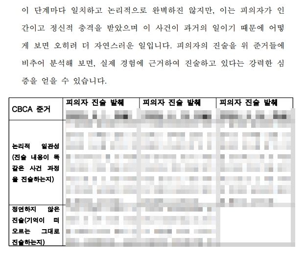 아울러 이쪽 진술에 대해 상대방은 강하게 공격해 올 것이기 때문에, 진술이 왜 신빙성 있는지 구체적으로 근거를 들어주는 것도 좋습니다. 저는 검사 시절에 연수원에서 배운 진술분석기법을 적용해 서면을 작성하는 것을 자주 하는 편인데, 전문 진술분석가들이 사용하는 CBCA 준거라는 것을 사용해 의뢰인의 진술을 구체적으로 분석하는 방식입니다.
