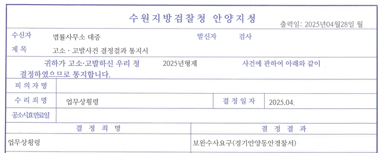 검사는 업무상 횡령죄에 대하여 재수사할 것을 요구하며 보완수사요구 명령 처분을 하였습니다.