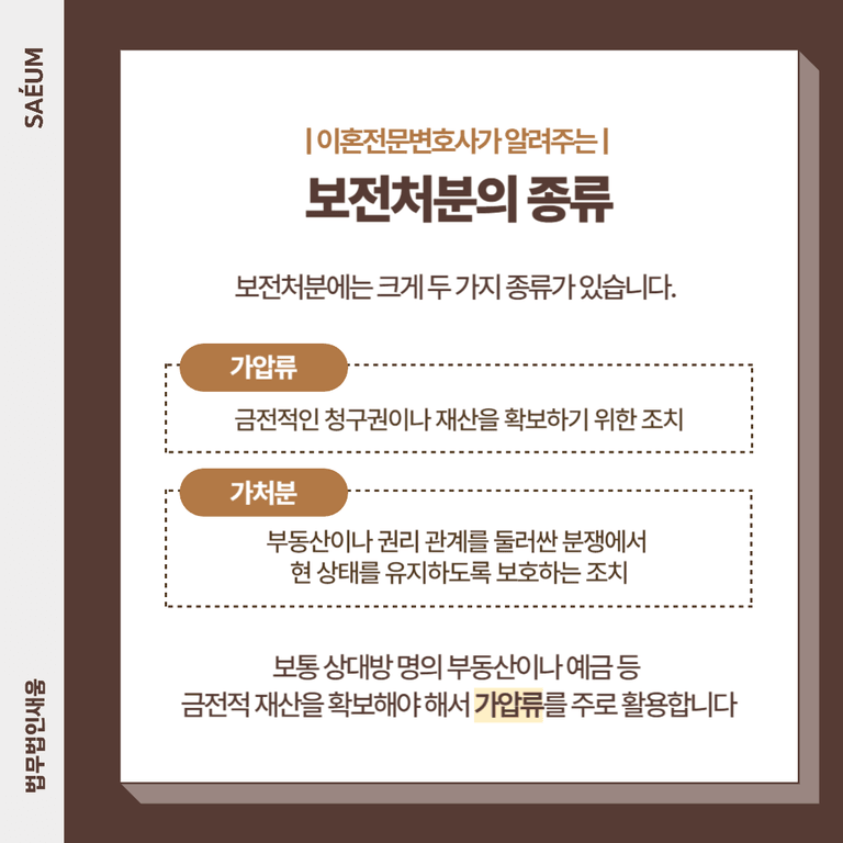 이혼 재산분할에서는 보통 상대방 명의의 부동산이나 예금 등 금전적 재산을 확보해야 하는 경우가 많기 때문에, ‘가압류’를 주로 활용합니다.