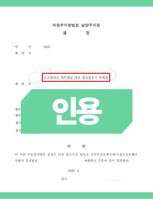 본 법무법인은 사건의 긴급성과 A씨의 구체적인 사정을 신속히 파악하고, 관련 서류를 정리하여 접수 후 7일 만에 부동산 가압류 결정을 받아낼 수 있었습니다.