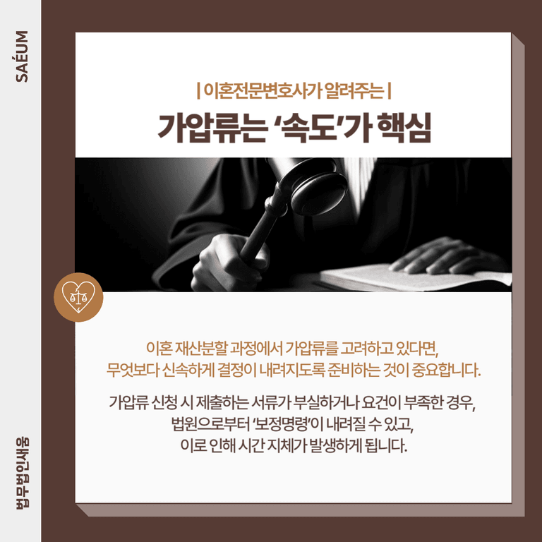 가압류 신청 시 제출하는 서류가 부실하거나 요건이 부족한 경우, 법원으로부터 ‘보정명령’이 내려질 수 있고, 이로 인해 시간 지체가 발생하게 됩니다. 이는 상대방에게 유리한 결과를 낳을 수 있으므로, 서류 준비는 처음부터 철저하게 해야 하며, 이 또한 이혼전문변호사의 경험이 매우 중요한 부분입니다.