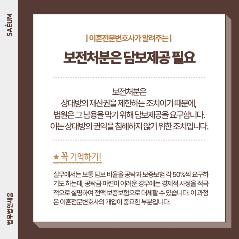 실무에서는 보통 담보 비율을 공탁과 보증보험 각 50%씩 요구하기도 하는데, 공탁금 마련이 어려운 경우에는 경제적 사정을 적극적으로 설명하여 전액 보증보험으로 대체할 수 있습니다. 이 과정은 이혼전문변호사의 개입이 중요한 부분입니다.