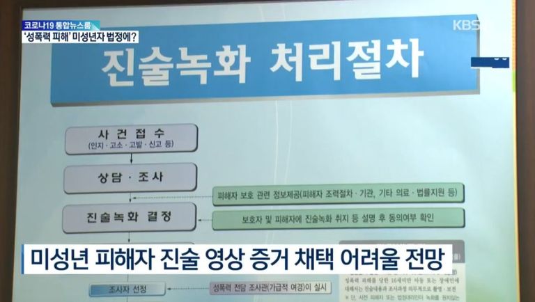 이에 대해 법무부는 ‘성폭력 아동을 위한 아동친화적 증거보전 제도’ 도입을 위하여 법안을 발의하며 "법정 출석은 단순히 미성년 피해자가 물리적으로 법정에 서야 한다는 것뿐만 아니라 낯선 장소에서 낯선 사람들의 질문에 대답해야 한다는 점, 변호인의 공격적 신문의 대상이 된다는 점, 사건으로부터 먼 시점에 다시 피해경험을 회상해 진술해야 하는 점 등 피해아동이 극심한 정서적 고통을 겪겨나 최상의 증거를 취득하기 어려울 수 있기 때문에 개정안을 마련했다"고 입법취지를 밝혔습니다.