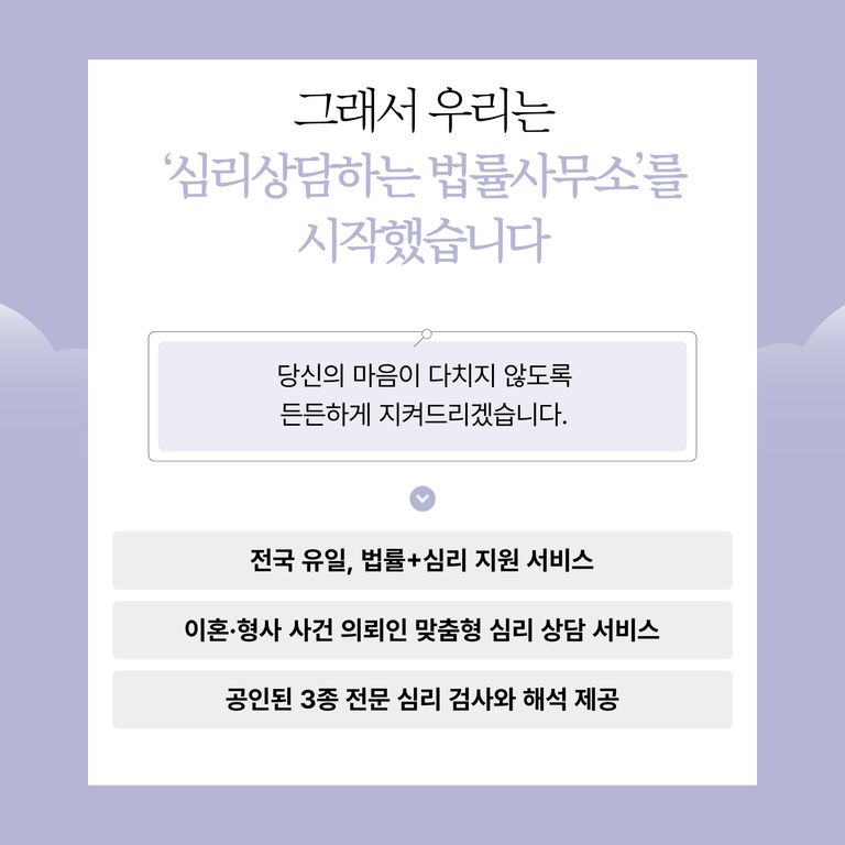 변호사와 심리상담사가 한 공간에서, 같은 마음으로 의뢰인을 만납니다.