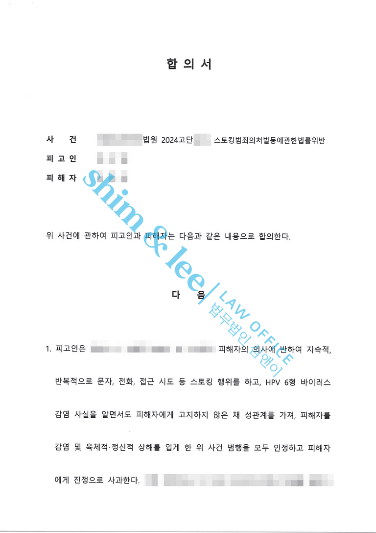 - 의뢰인은 심앤이 덕분에 멈추지 않을 것 같았던 가해자의 지독한 스토킹으로부터 벗어나 일상 회복에 한 걸음 더 다가갈 수 있었고, 통상적인 합의금보다 높은 금액의 피해 보상까지 받을 수 있었습니다.