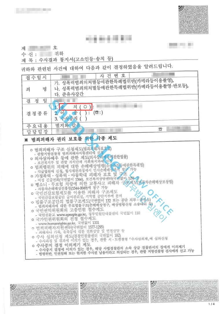 - 담당 수사관은 고소장에 담긴 가해자의 구체적인 범행과 의뢰인의 일관된 진술을 종합한 결과, 피해자 진술의 신빙성이 높다고 판단하였습니다. 사건은 대표 변호사님이 특정했던 카메라등이용촬영, 카메라등이용촬영·반포등, 준유사강간 세 가지 죄명 모두 가해자의 범행이 인정되어 검찰로 송치되었습니다.