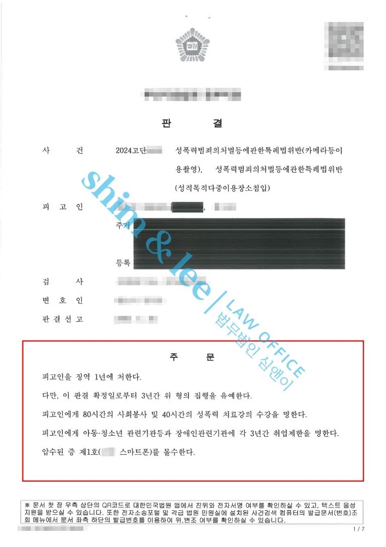 -또한, 합의가 이루어졌음에도 불구하고 재판부는 가해자에게 징역 1년, 집행유예 3년을 선고하였으며 사회봉사 80시간, 성폭력 치료 강의 80시간, 취업제한 3년, 압수된 증 제1호 몰수 등 이례적인 부가처분까지 함께 부과하였습니다.
