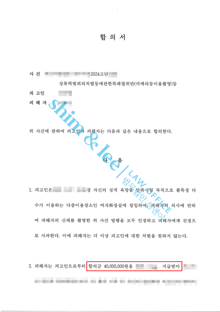 -단호한 대표 변호사님의 태도에 당황한 가해자는 합의금을 마련할 시간을 조금만 달라며 간절히 호소하였고, 최종적으로 합의금 4,000만 원과 함께 자신의 범행에 대해 사죄하는 사과문을 전달하였습니다. 해당 사과문에는 사건에 대한 책임을 인정하고, 피해자에게 진심 어린 사과를 전하려는 반성의 의지가 담겨 있었습니다. 합의서에는 비밀유지, 접근금지, 통신제한 등 의뢰인에게 유리한 조항들을 포함시켜 의뢰인에게 실질적으로 유리한 방향으로 합의를 이끌어냈습니다.