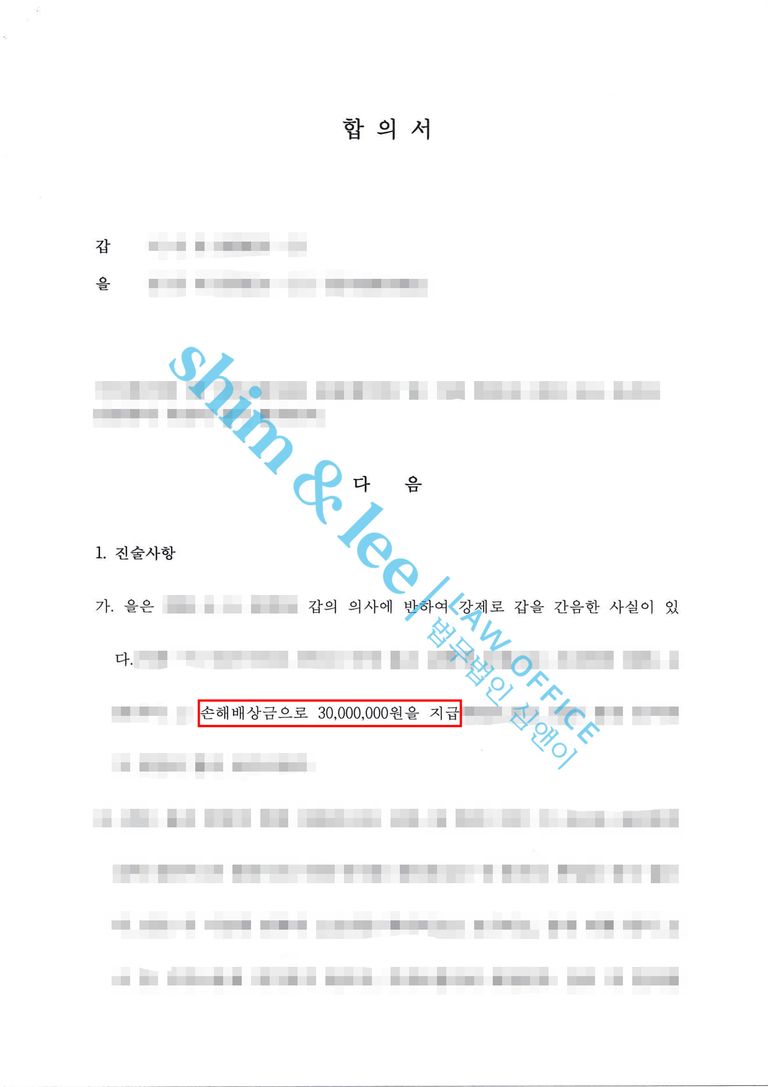 - 대표 변호사님의 단호한 태도에 가해자는 합의가 결렬되고 형사고소가 진행될 것을 우려하여, 단기간에 처음 제안한 금액의 3배인 합의금 3,000만 원을 마련하였으며, 의뢰인에게 유리한 조항들을 모두 반영한 합의서를 작성하였고, 최종적으로 원만한 합의에 이르게 되었습니다.