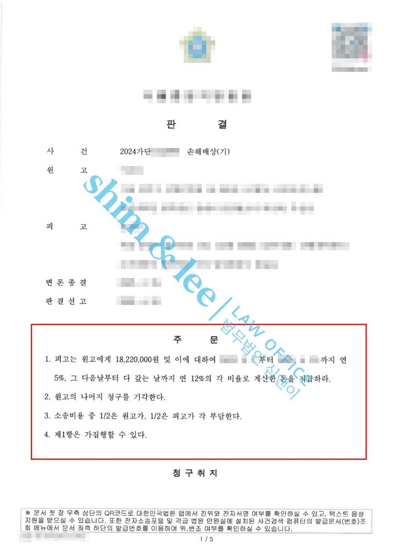 -결국 조정은 불성립되어 다시 본안 소송이 진행되었고, 최종적으로 심앤이가 주장한 ①변호사 선임 비용 ②정신과 통원 치료비 ③정신적 피해에 대한 위자료가 인정되어 손해배상금으로 총 18,220,000원을 인용받았습니다. 또한, 판결금 외에도 사건 발생일부터의 지연 이자가 가산되면서 의뢰인은 최종적으로 상당한 금액의 위자료를 받을 수 있게 되었습니다.