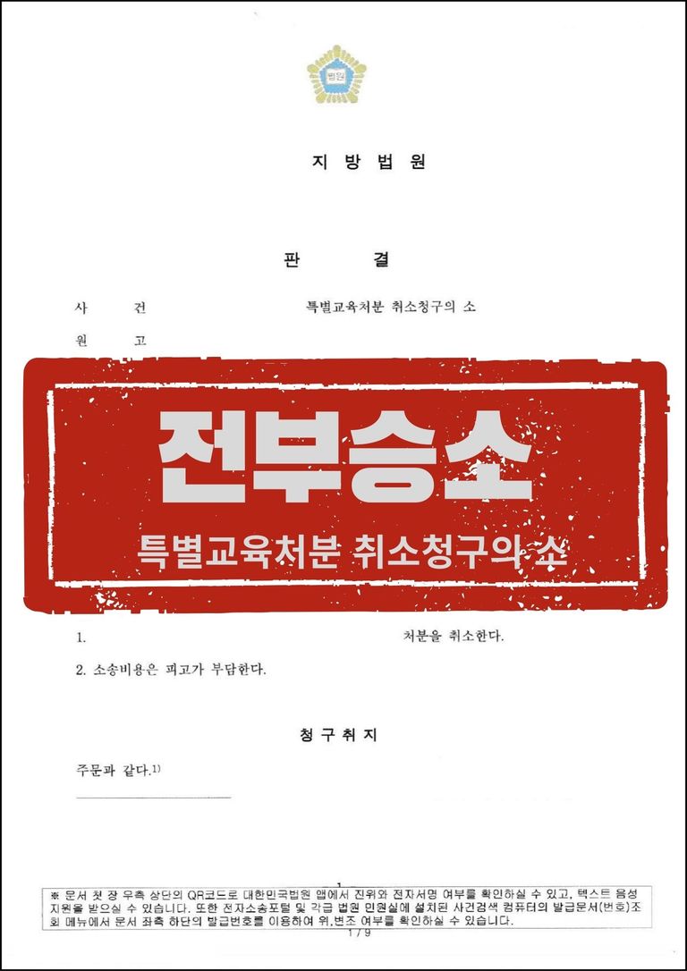 결국 재판부는 교육지원청의 결정을 전부 취소하고 저희 의뢰인이 교육활동 침해행위를 한 적이 없음을 확인하여 주었습니다(우리 의뢰인의 변호사비용은 전부패소한 교육지원청이 냅니다!).