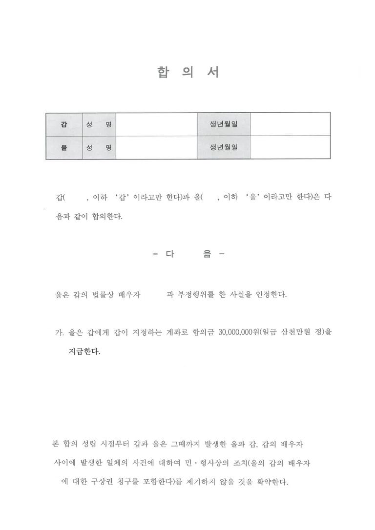 ■ 그 뿐만 아니라 남편에게 구상권을 행사하지 못한다는 내용, 향후 남편에게 연락을 하거나 만남을 요구할 시 합의금을 몰취하고 위약벌로 추가 합의금을 지급한다는 내용을 합의서에 포함시켰습니다.
