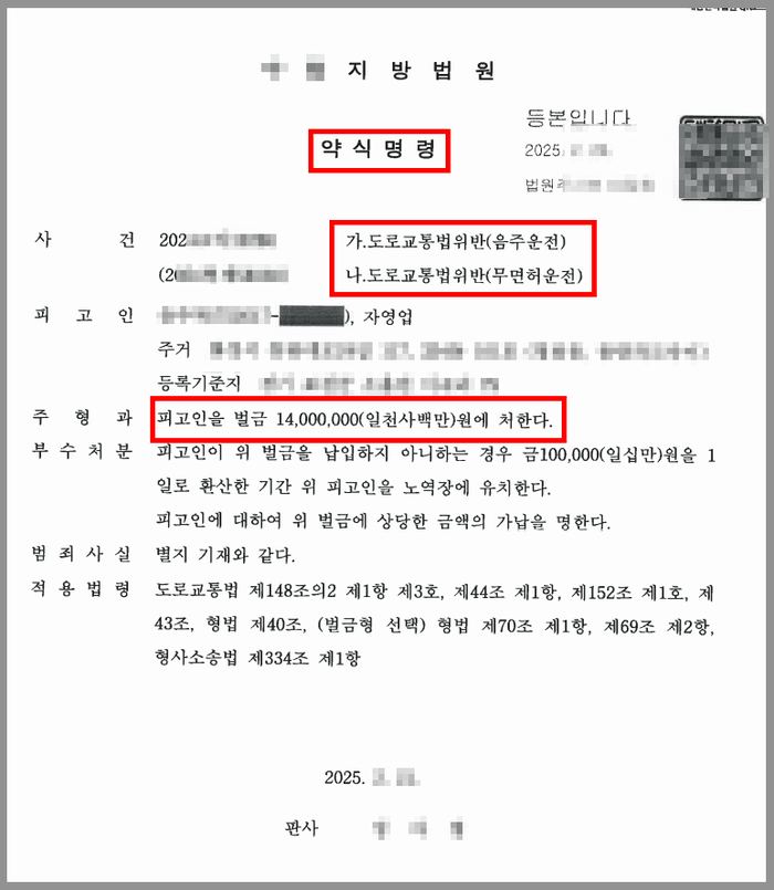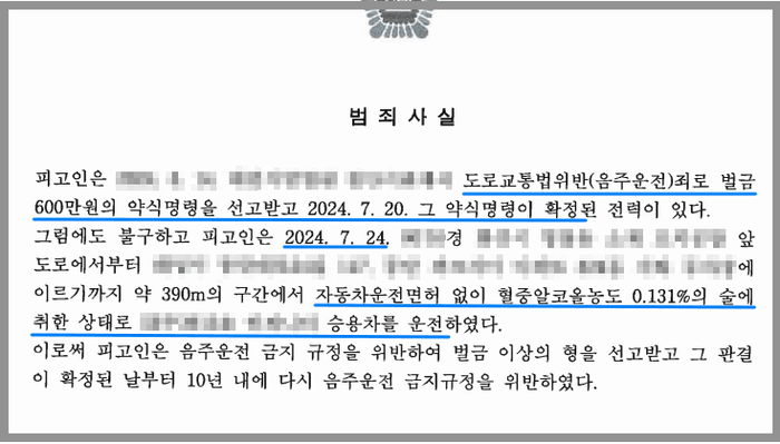 의뢰인은 면허 취소 수준의 술에 취한 상태에서 운전을 하다가 적발되어 벌금형의 약식명령을 받은 바 있었는데, 그 약식명령이 확정되고 불과 나흘 만에 면허가 취소된 상태에서 또 다시 음주운전을 하다가 적발되었습니다.