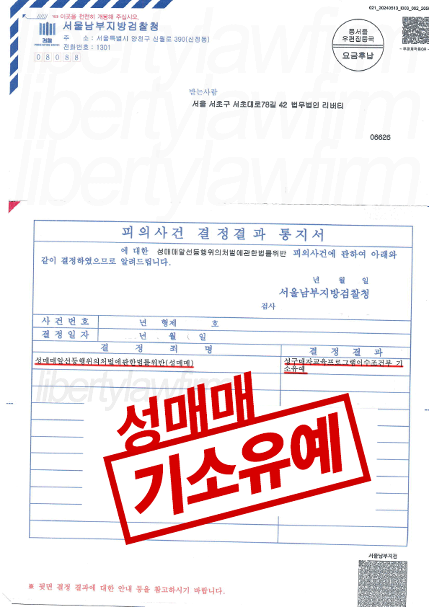 최근 의뢰인이 확실한 증거확보로 성매매 고소를 당한 사건에서, 리버티 성매매전문 변호사가 조력하여 기소유예 판결을 이끌어내었습니다.