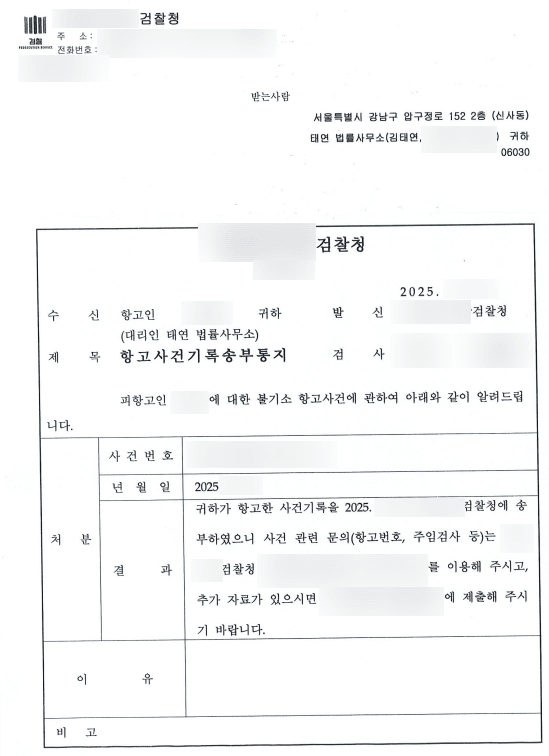 이로 인해 불기소처분, 불송치처분을 받은 후 이의신청 항고 신청을 위해 저희 태연법률사무소에 연락주셔서 위임해주시는 사례가 있습니다.
