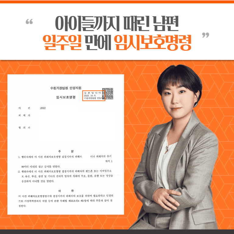 2022. 9. 29. 우편을 통하여 임시보호명령이 필요한 이유를 강조한 피해자보호명령 신청서를 접수하였으며, 2022. 9. 30. 신속한 임시결정을 촉구하는 서면을 추가로 제출한바, 2022. 10. 5. 단 일주일만에 임시보호명령(피해자보호명령 결정 시까지 상대방의 접근을 금지하는 내용)을 받을 수 있었습니다.