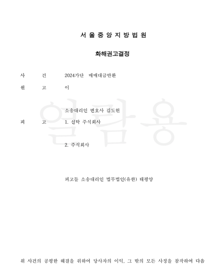 결국, 1심 판결선고기일이 지정된 상황에서, 시행사 측이 패소의 위험이 있다고 판단하여, 원만히 상호 합의하여 화해권고결정으로 사건을 마무리 하였습니다.