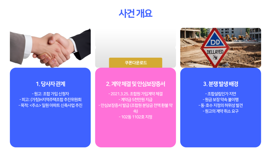 이 사건은 특히 ‘조합원계약 안심보장증서’와 그 효력을 둘러싼 실질적인 법리 해석을 담고 있어, 지역주택조합 가입을 고려 중인 분들에게 중요한 시사점을 제공합니다.