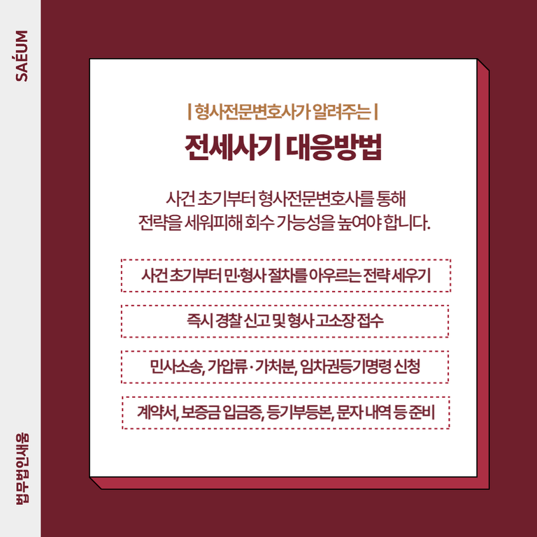 따라서 전세사기 피해가 의심된다면, 형사고소(사기죄 등)와 민사소송(전세금 반환청구) 을 동시에 준비해야 하며, 가압류·가처분 신청, 임차권등기명령 등 보전조치도 신속히 진행해야 합니다.