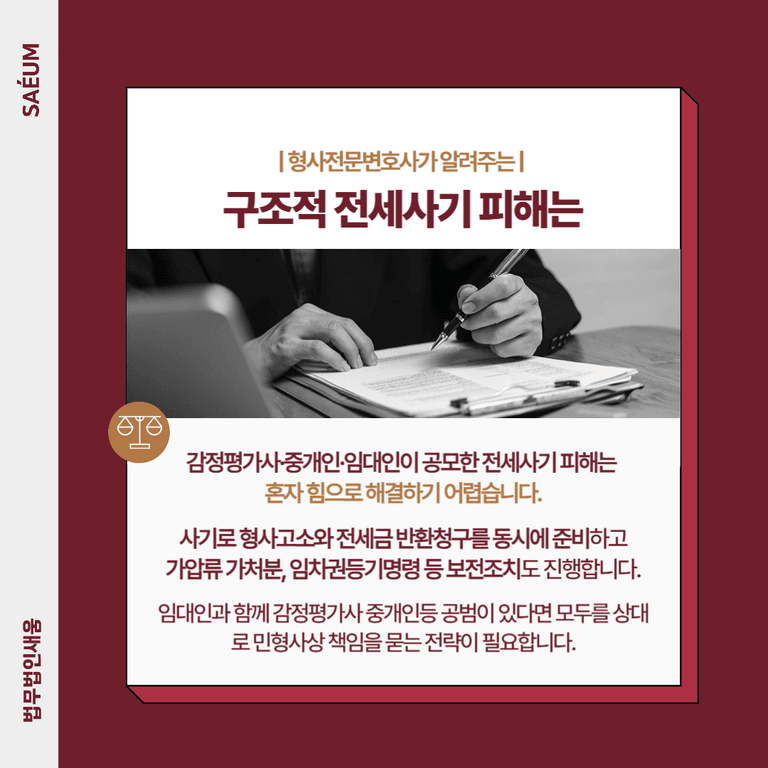 A씨의 사례에서처럼, 감정평가사·중개인·임대인이 조직적으로 공모한 전세사기 피해는 혼자 힘으로 해결하기 어렵습니다.