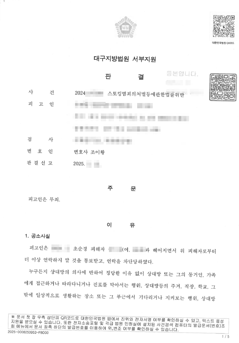 검찰이 제출한 증거기록과 스토킹처벌법에 있어서의 법리부분을 변론하여 무죄를 주장하는 방향으로 설득하였습니다.