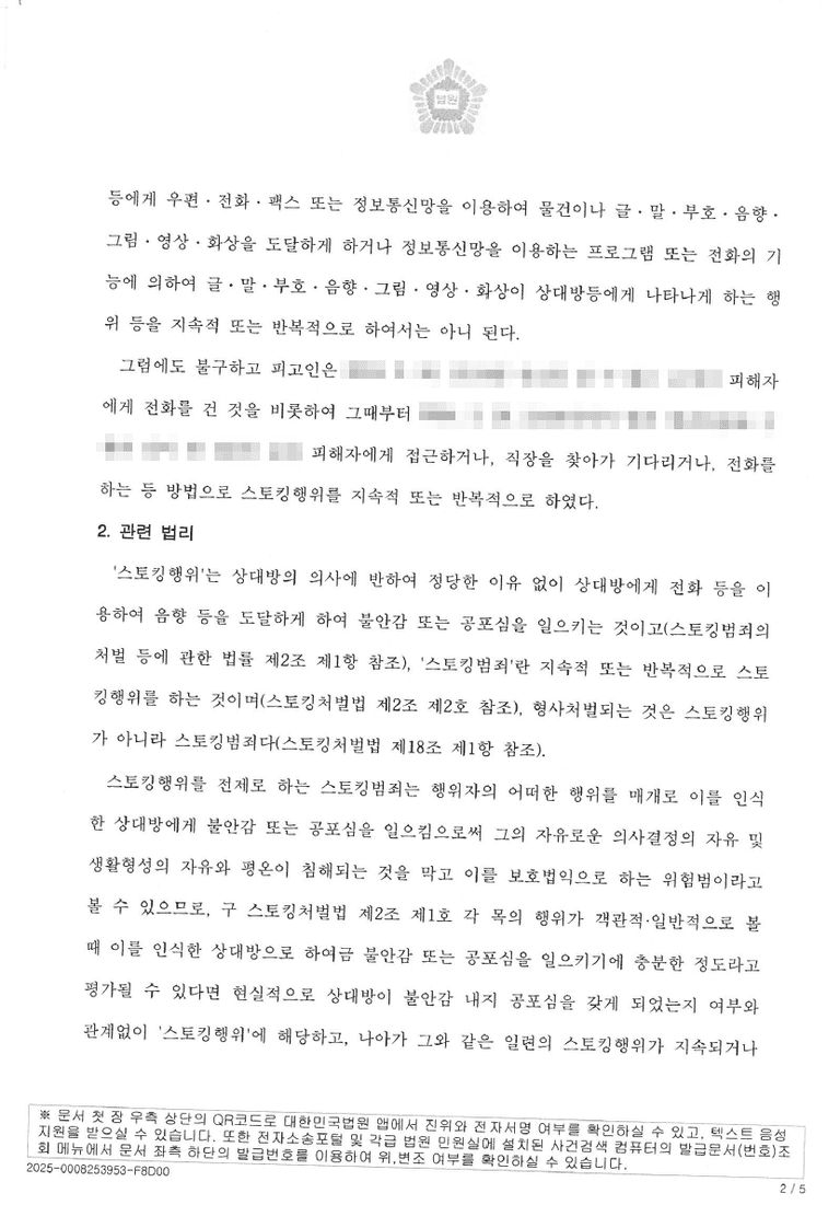 저는 상대방의 거부의사를 표명한 이후에는 상대방에게 지속적 또는 반복적으로 접근하거나 연락하면 안된다는 원론적인 이야기를 하였고 피고인은 본인은 정당한 이유가 있었고 자신의 연락으로 상대방이 위협을 느꼈다는 것도 이해가 되지 않는다고 변소하였습니다.