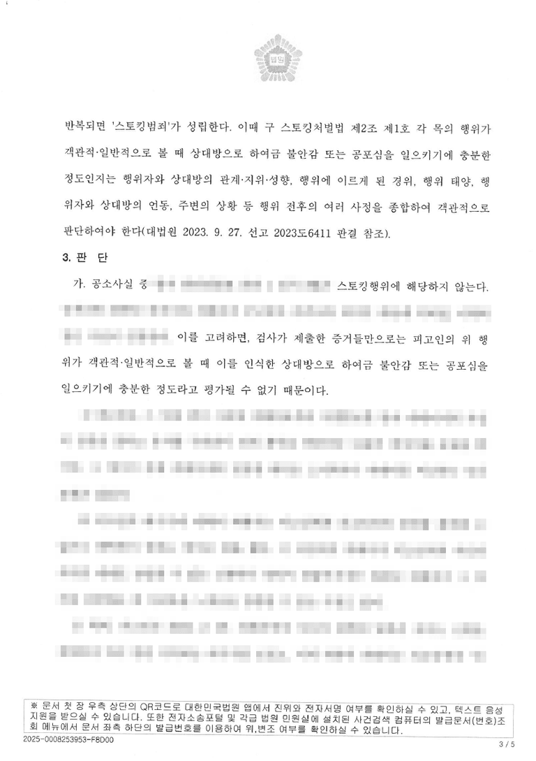 전단의 행위는 상대방으로 하여금 불안감 또는 공포심을 일으키기에 충분하지 않아 스토킹범죄에 해당하지 않고,