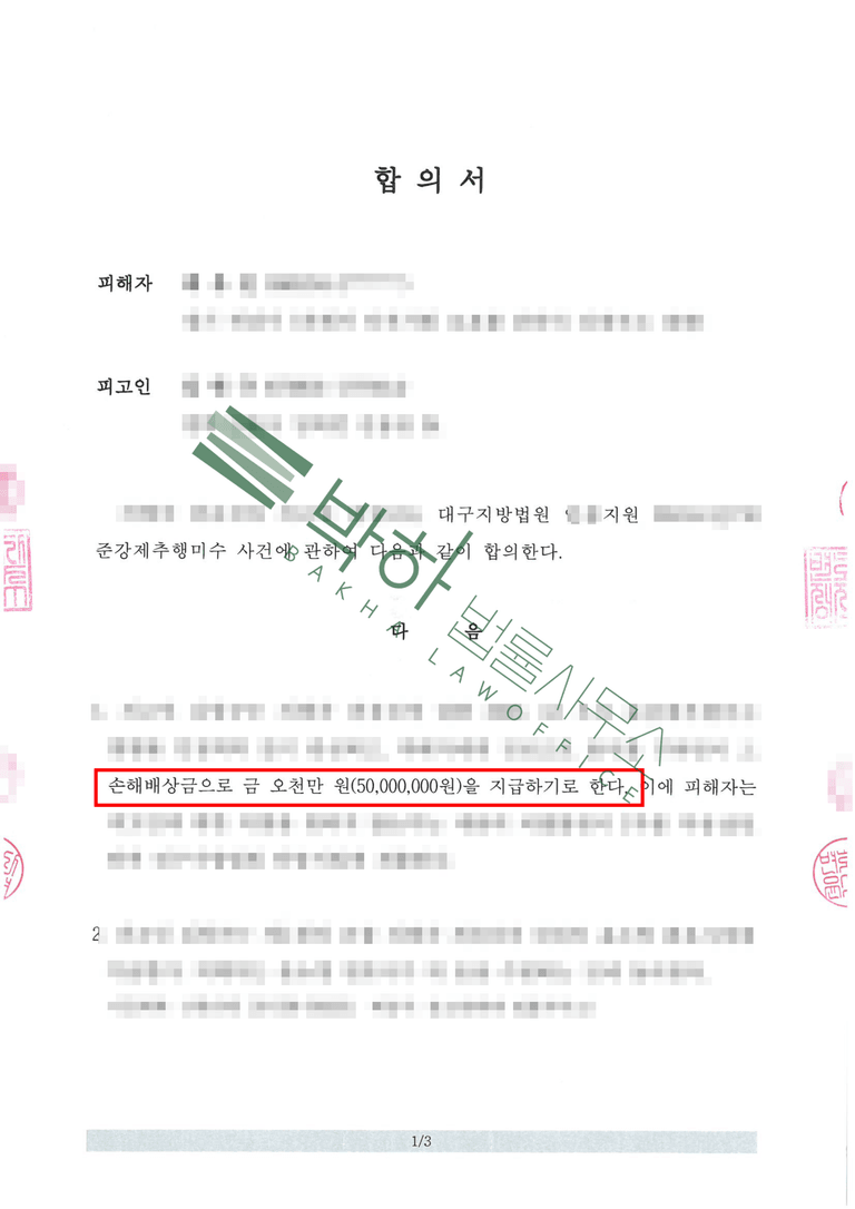 1심 선고 직전까지 합의 시점을 끌어온 윤소영 변호사의 노련한 협상 전략으로 가해자 측은 합의금을 추가로 마련하였고 결국 5,000만 원에 합의가 이루어질 수 있었습니다.