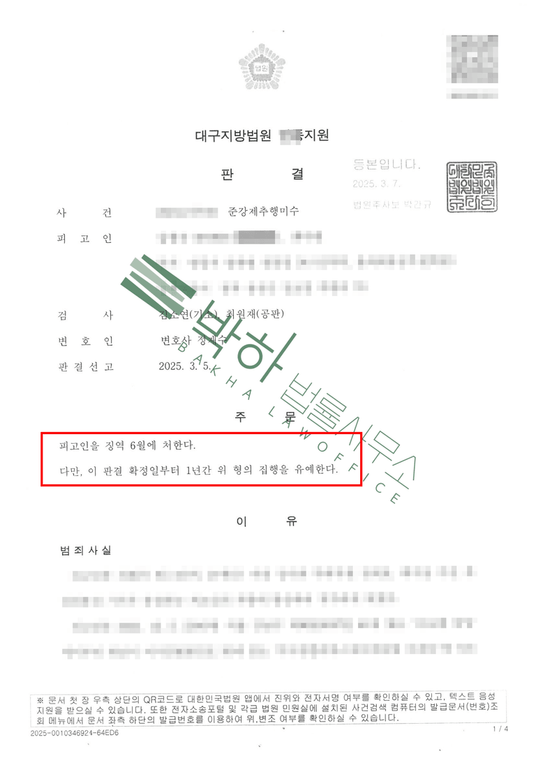 가해자가 범행을 인정하고 피해자와 5,000만원에 합의를 하였음에도 가해자는 징역 6월, 집행유예 1년을 선고받았습니다.