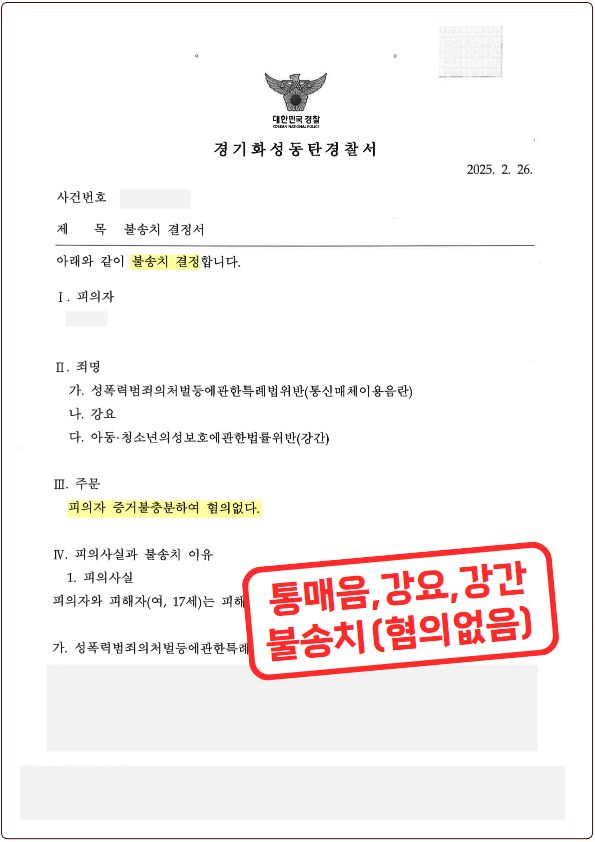 ![[형사] 통매음, 강요, 아청법위반(강간) 불송치(혐의없음)](/_next/image?url=https%3A%2F%2Fd2ai3ajp99ywjy.cloudfront.net%2Fuploads%2Ftitleimage%2Foriginal%2F5c3c3a43d6eaba3fdcd0b96f-original.jpg&w=3840&q=75)