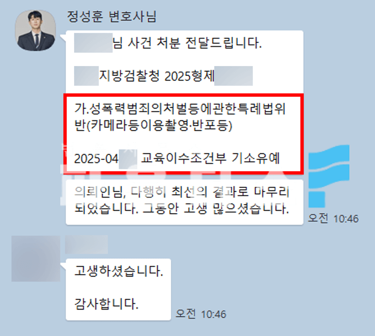 그 결과 의뢰인은 피해자와 성관계를 하던 중 불법촬영을 한 카메라등이용촬영 사건에 있어 기소유예 처분으로 처벌 및 전과 위기에서 벗어날 수 있었습니다.