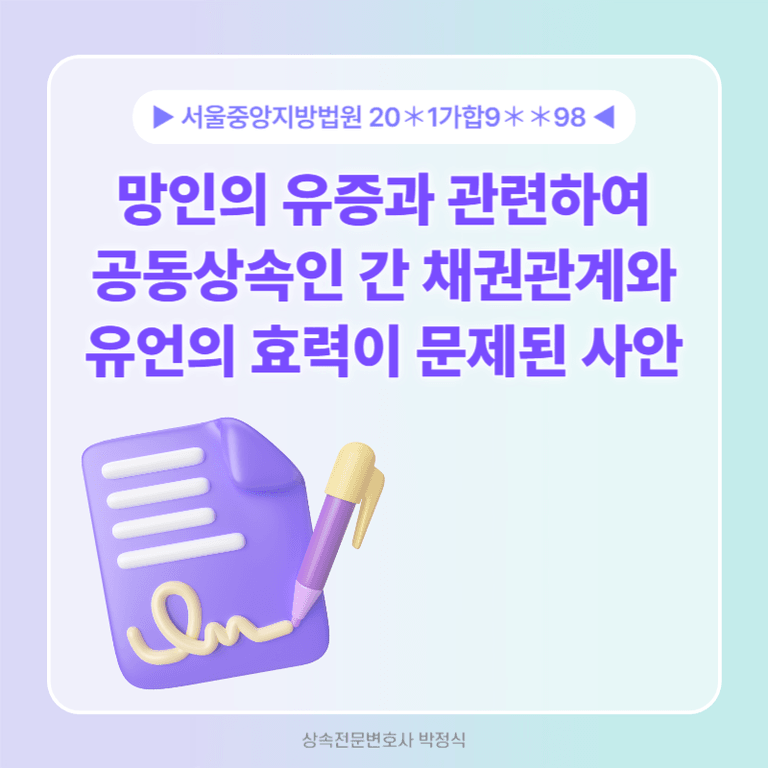 원고와 피고는 부친의 생전 예금채권을 각 1/3지분, 2/3지분만큼 유증받은 자입니다. 그리고 망인이 사망한 뒤 얼마지나지 않아 원고는 피고에게 예금채권과 별개로 일정 금원을 입금해주었습니다. 이후 피고는 위 유언에도 불구하고 예금채권 중 자신의 지분을 초과하는 원고의 지분까지 모두 인출하여 사용하였습니다.