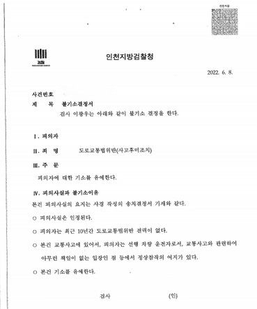검찰은 의뢰인이 사고에 아무런 책임이 없는 선행 차량 운전자(피해자)였다는 점과 여러 참작 사유를 받아들여, 전과가 남지 않는 '기소유예' 결정을 내렸습니다.