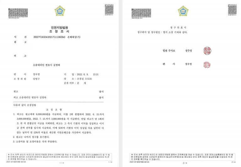 조정절차 회부되어 피고에게 유리한 조건으로 조정성립됨.