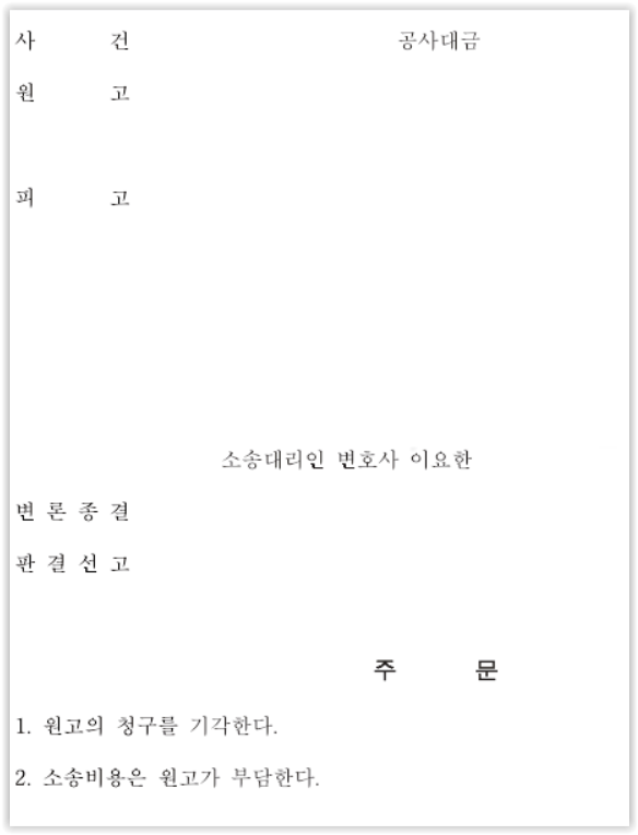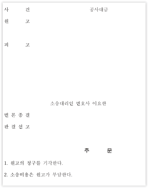 재판부는 원고의 공사대금 채권이 없다고 판단하면서 원고 청구를 전부 기각하였습니다.