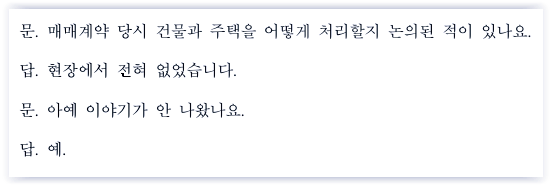 계약서 작성 경위에 대해 확인하기 위해 최초 의뢰인을 원고에게 소개시켜 준 동네 이장과 부동산 중개업자에 대한 증인신문을 진행하였습니다. 위 자들은 공통적으로 계약 당시 건물과 주택에 대해 논의한 적이 없었다고 증언하였습니다.