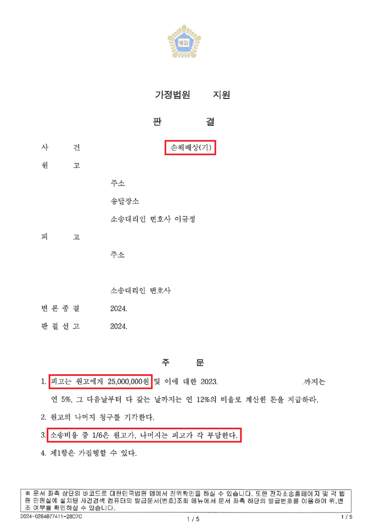 소송비용도 5/6을 상대에게 청구하시며 마무리할 수 있었던 사안입니다.