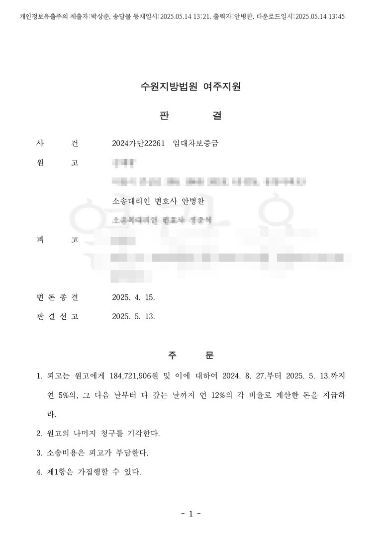 사건내용: 원고는 2019.10월 경 xxx사이에 이천시 중리동의 아파트에 관하여 원고가 xxx으로 부터 임대차보증금 1억 9000만원, 계약기간을 2019.10-2021.10.까지 임대차계약을 체결하였습니다.