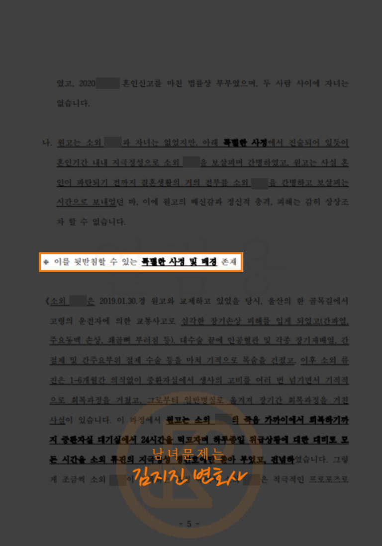 그리고 무엇보다 이 사건을 파악해나가면서 저는 일반적인 상간사건과 다른 의뢰인의 '특별한 사정과 배경'이 있다고 판단하였는 데요. 바로 앞에서 설명드렸던 상황입니다. 이러한 부분이 재판에서 유리하게 작용할 수 있다고 보아 적극 피력하였고, 의뢰인이 이 사건으로 받은 충격과 고통이 얼마나 크고 무거운 것인지 강조하였습니다.