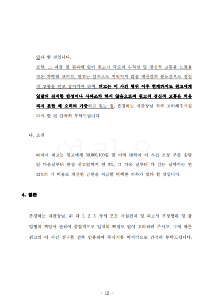 이러한 판결이 의뢰인이 받은 고통을 없던 것으로 만들 수는 없겠지만, 그럼에도 피해회복을 위한 최소한의 보상은 될 수 있었으 면 하는 마음입니다. 같은 상간 사건이라도 어떤 변호사가 대리하느냐에 따라 결과는 크게 달라질 수 있습니다. 부디 잘 알아보시고 의뢰인의 상황을 면밀히 분석하여 마지막까지 든든한 조력자가 되어 줄, 믿을 수 있는 전문 변호사의 조력을 받으시기 바랍니다.