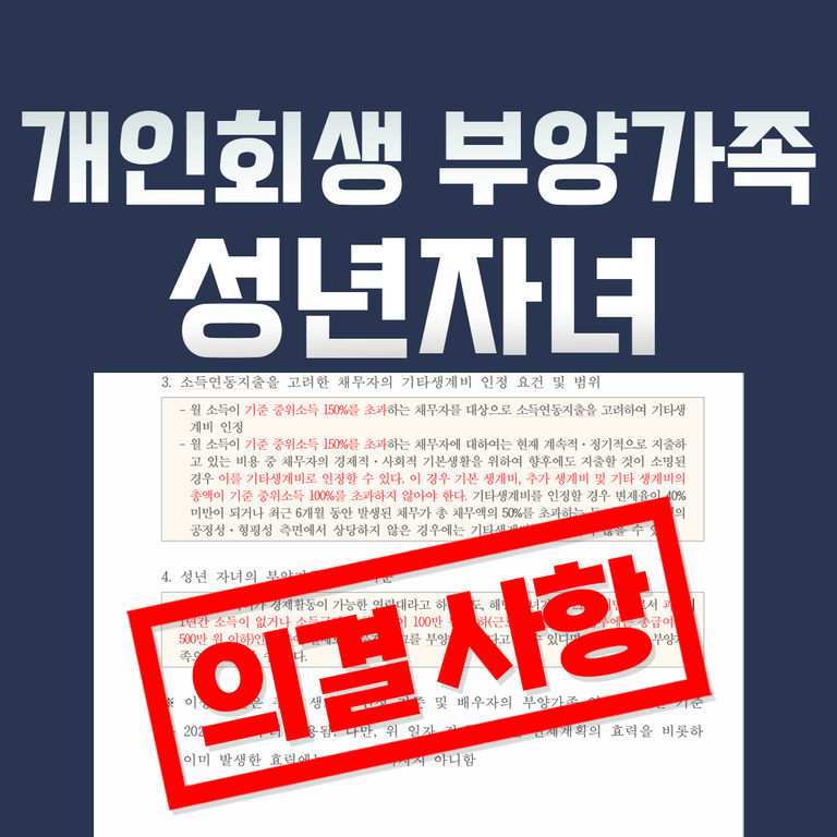 따라서 성년 자녀가 부양가족으로 포함될 수 있는지에 대한 정확한 판단이 중요하며, 채무자는 이 부분을 명확하게 검토하여 최대한 유리하게 진행해야 합니다. 아무래도 이때는 매일매일 사건을 진행하여 현황에 익숙한 민사법전문변호사의 도움을 받으시는 것이 좋겠지요.