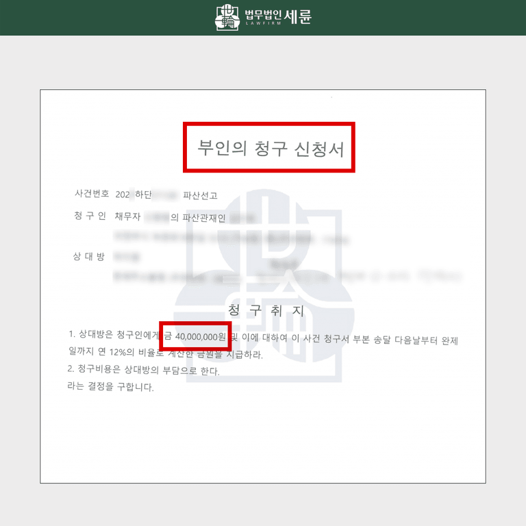 저희 변호사 사무실을 찾아주신 의뢰인 A 씨는 얼마 전, 부인의 청구 소장을 받은 분이었습니다. 해당 소송의 채무자는 다름 아닌 전 남편이었는데요. 전 남편의 파산관재인이 보내온 것이었지요. 파산관재인은 A 씨는 채무자 전 남편에게 약 4천만 원을 지급할 것을 청구했습니다.