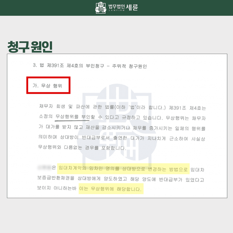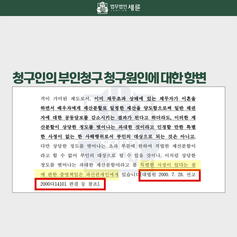 그리고 파산관재인이 반환하라는 4천만 원이라는 임대차보증금에 대해서는 재산분할 및 위자료 목적으로 3천만 원을 입금 받은 것으로, 이를 두고 무상행위라고 볼 수는 없다고 피력했습니다. 다만 상당한 정도를 벗어나는 초과 부분에 한하여는 부인의 대상이 될 수 있지만. 이에 대한 증명책임은 우리 의뢰인이 아닌, 파산관재인에게 있다고 주장했습니다. 대법원 판례를 인용하면서 말이지요.